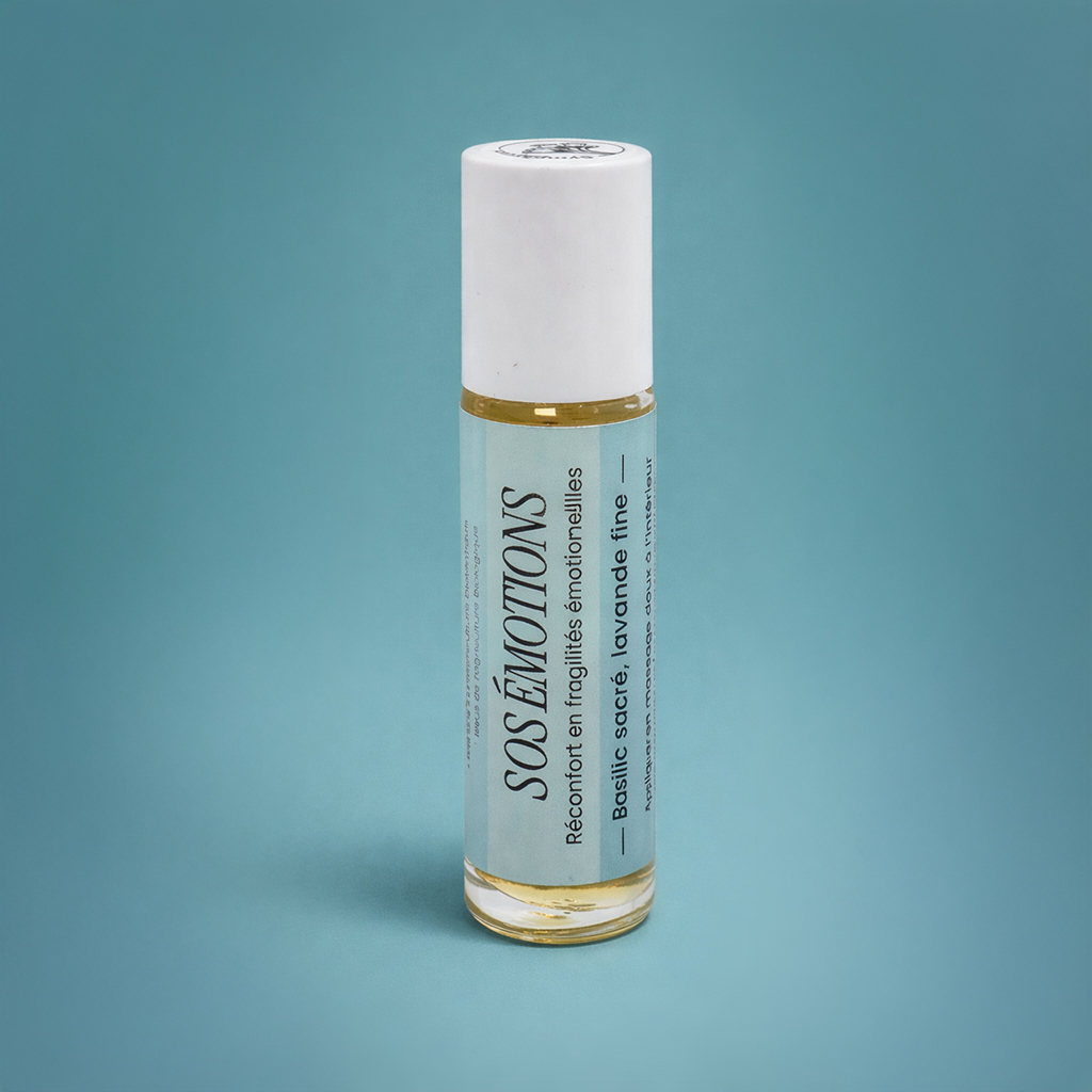 Notre Roll‑on SOS Émotions est un macérat de fleurs de basilic Sacré, cultivé et transformé par nos soins en Bretagne, associée à des huiles essentielles biologiques choisies pour leur action sur l’équilibre émotionnel. Une formule pensée pour apaiser l’esprit, rééquilibrer le système nerveux et accompagner les émotions du quotidien. Petit outil de bien‑être, à garder toujours près de soi.